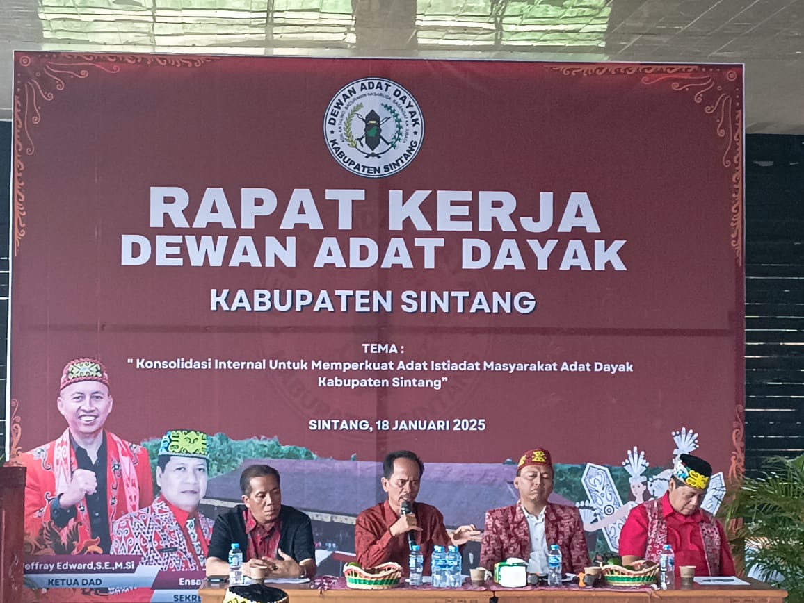 Dinastinews.com – Kalimantan Barat. Gregorius Herkulanus Bala pengurus DAD Provinsi Kalimantan Barat yang juga Bupati Sintang terpilih menyampaikan materi pada pelaksanaan Rapat Kerja Dewan Adat Dayak Kabupaten Sintang pada Sabtu, 18 Januari 2025 di Betang Tampun Juah Jerora Satu.