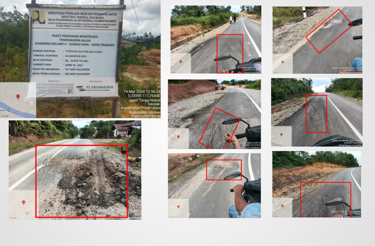 “Sangat disayangkan Bang angaran yang sangat besar di gunakan untuk peningkatan jalan Jembatan Melawi Dua, Sungai Raya – Natai Panjang ini, secepat itu rusaknya, nampaknya emang kurang Kwalitas nya bang, kalau kwalitas bahan dan pengerjaan nya bagus ngak mungkin secepat itu rusak, Karna kami melihat juga aspalnya juga tipis dan batunya juga banyak mengunakan batu sungai, mungkin itu lah penyebabnya bang,” ujar Hendra.