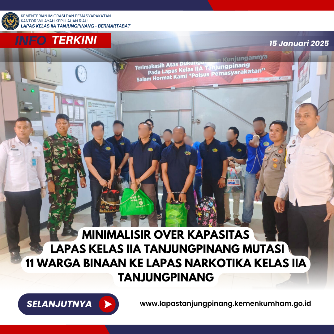 MINIMALISIR OVER KAPASITAS, LAPAS KELAS IIA TANJUNGPINANG MUTASI 11 WARGA BINAAN KE LAPAS NARKOTIKA KELAS IIA TANJUNGPINANG 15-01-2025 – Lembaga Pemasyarakatan Kelas IIA Tanjungpinang — KANWIL KEMENTERIAN HUKUM DAN HAM RI KEPULAUAN RIAU