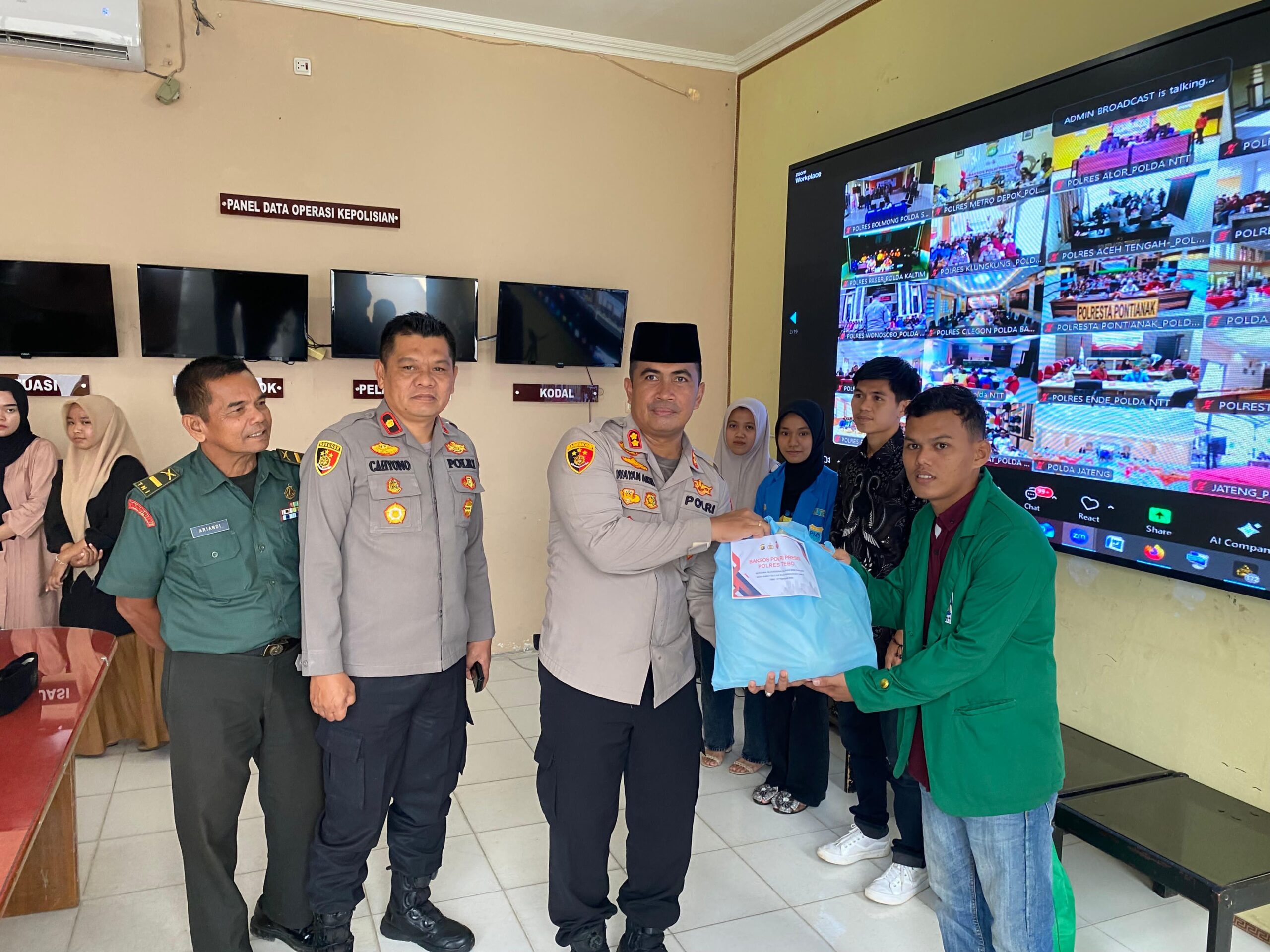 Polres Tebo Gelar kegiatan Bakti Sosial (Baksos) Polri Presisi bersama Mahasiswa, Aliansi BEM, dan Organisasi Kemasyarakatan Pemuda (OKP) dalam rangka menyambut bulan suci Ramadhan 1446 H/2025 M yang digelar secara virtual melalui Zoom Meeting pada Kamis (27/2/2025) pukul 10.00 WIB.