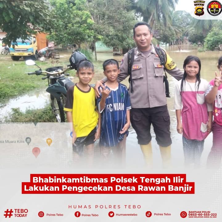 Bhabinkamtibmas Polsek Tengah Ilir, Bripka Rifelino Pratama, melaksanakan pengecekan daerah rawan banjir di wilayah hukumnya pada Sabtu, 10 Maret 2025. Dalam kegiatan ini, ia mendirikan posko bencana banjir bersama pihak terkait serta melakukan monitoring debit air Sungai Batang Hari di Desa Muara Kilis dan Desa Penapalan, Kecamatan Tengah Ilir, Kabupaten Tebo.