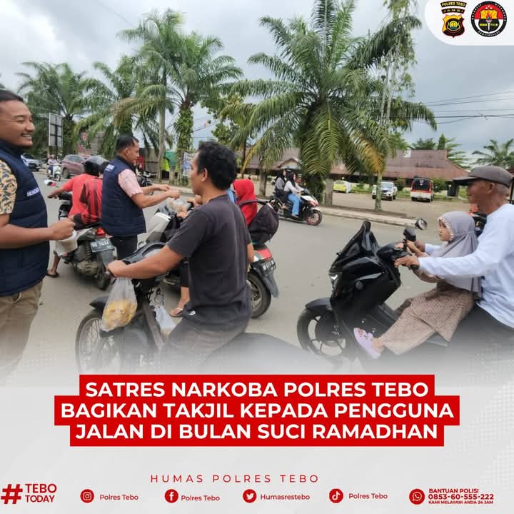 Dalam rangka menyemarakkan bulan suci Ramadhan, Satuan Reserse Narkoba (Satres Narkoba) Polres Tebo menggelar kegiatan berbagi takjil kepada para pengguna jalan