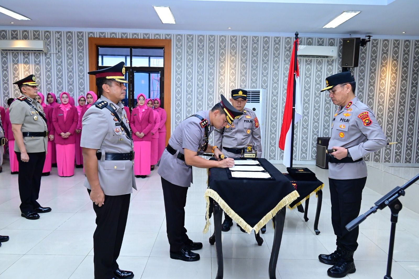 POLDA JAMBI – Kepolisian Daerah (Polda) Jambi menggelar upacara serah terima jabatan (Sertijab) Empat Pejabat Utama dan Satu Kapolres, bertempat di aula Lantai Empat Gedung Mapolda Jambi.