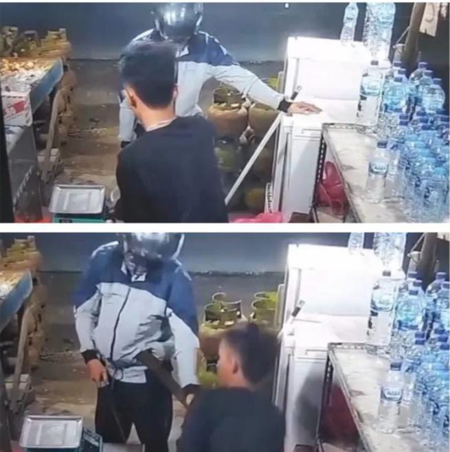 Berdasarkan rekaman CCTV yang beredar, seorang pria yang mengenakan helm dan penutup mulut berupa masker terlihat menodongkan senjata tajam kepada penjaga warung. Penjaga warung yang tampak ketakutan terlihat menuruti permintaan pelaku begal.