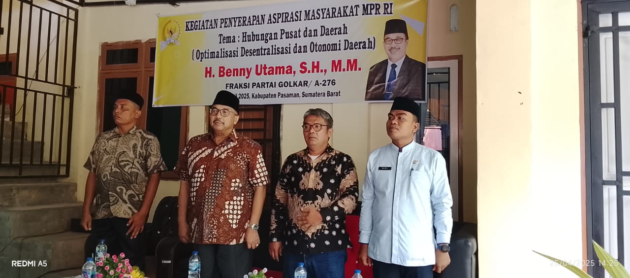DinastiNews.Com | Pasaman – Kegiatan penyerapan aspirasi masyarakat MPR.RI dengan tema ” Hubungan Pusat dan Daerah ( optimalisasi Desentralisasi dan otonomi daerah ) , bersama H.Benny Utama S.H., M.M.dari fraksi Golkar / A-276, didampingi Dosen Hukum Tata Negara Fakultas Hukum Unand Padang Dr.Zennis Helen, S.H., M.H ,di halaman Kantor Wali Nagari Panti selatan , Jumat 23 April 2025 ,