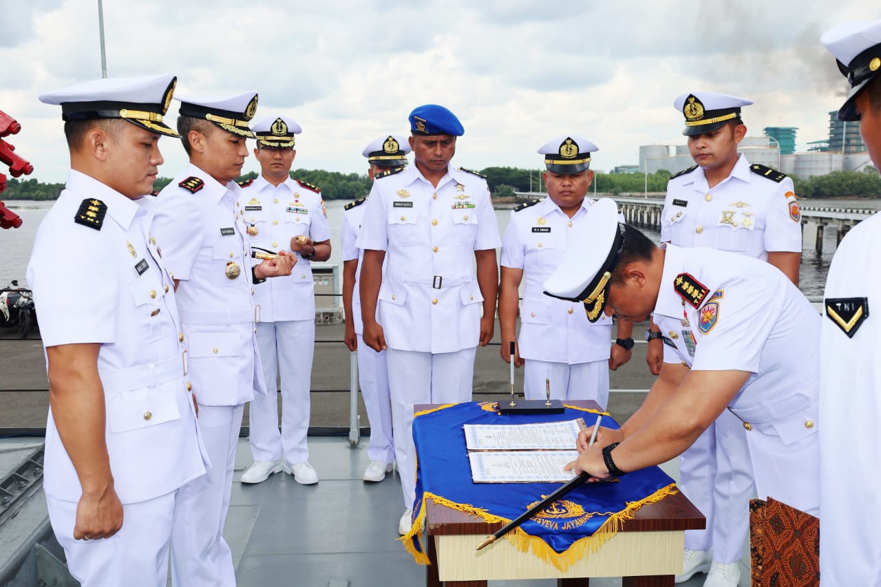 DinastiNews.com Dumai — Ditengah tugas melaksanakan pengamanan perbatasan Indonesia-Malaysia dalam Operasi Tameng Ghora, KRI Imam Bonjol-383 resmi melaksanakan pergantian Komandan. Adapun jabatan Komandan KRI Imam Bonjol-383 yang semula dijabat oleh Letkol Laut (P) Nana Suryana Idris S.T.,M.Tr.Opsla., diserahterimakan kepada penggantinya Letkol Laut (P) Rayindra Asmara, M.Tr.Opsla.