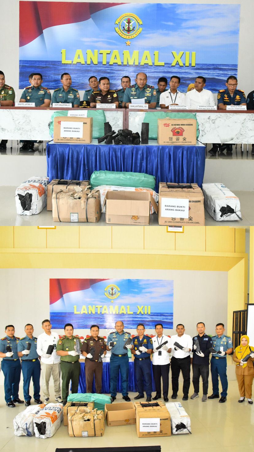 Dinastinews.com – Pontianak,kalimantan barat,TNI AL, Lantamal XII — Komandan Lantamal XII, Laksamana Pertama TNI Dr. Hariyo Poernomo, M.Han. menggelar konferensi pers terkait keberhasilan Tim Fleet One Quick Response (F1QR) Lantamal XII bersama Tim Satgas Ops Intelijen Terpilih Mamba-25K TA 2025 dalam mengungkap dua kasus pengangkutan arang bakau ilegal di wilayah perairan Sungai Kapuas dan Sungai Raya, Kalimantan Barat. Konferensi pers dilaksanakan di Gd. Malahayati Mako Satrol pada Senin (30/06)