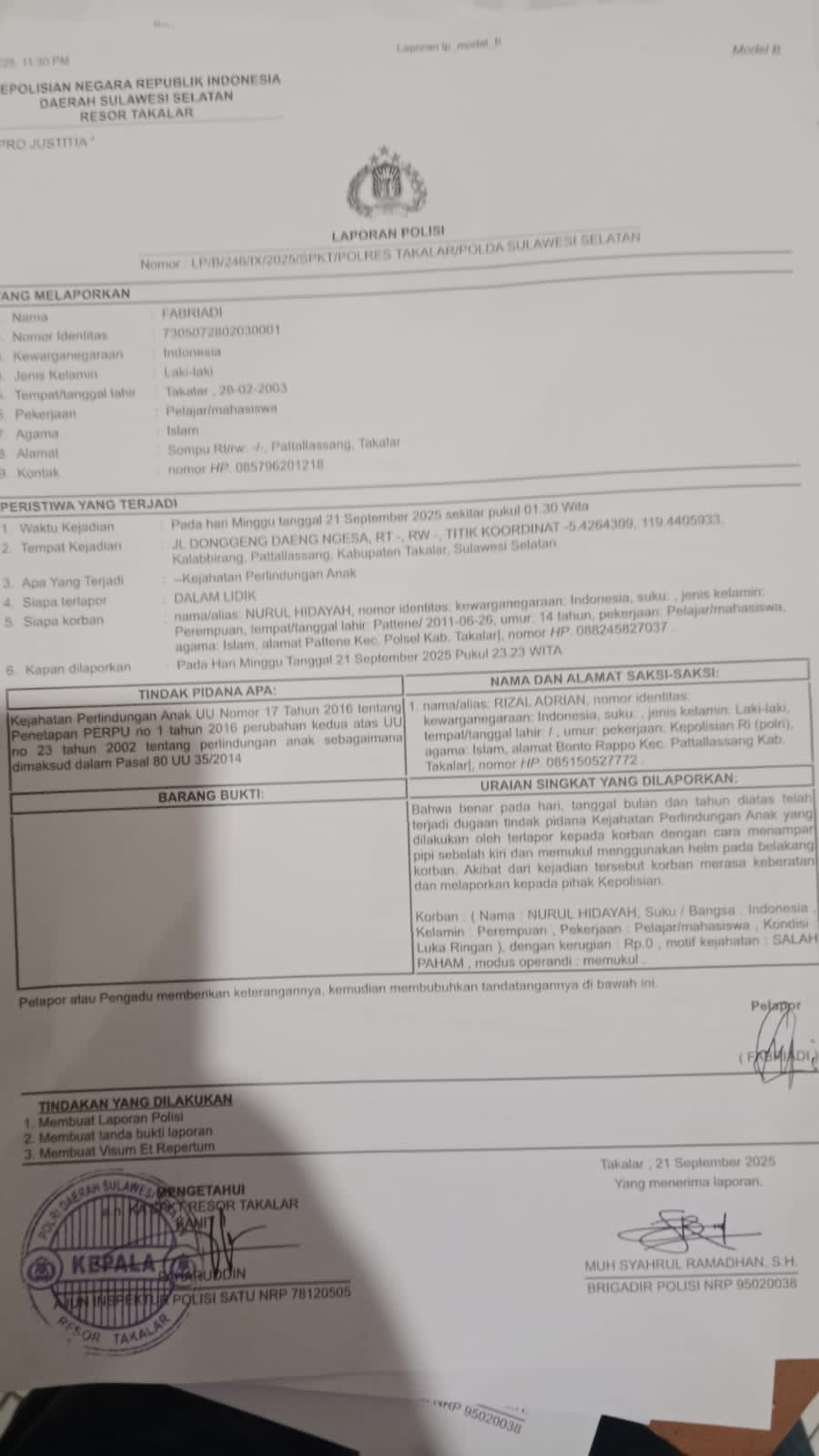 “Besoknya baru saya kembali ke Polres Takalar, tepatnya tanggal 21 September 2025, dan saat itu laporan saya akhirnya diterima,” ungkap NH.