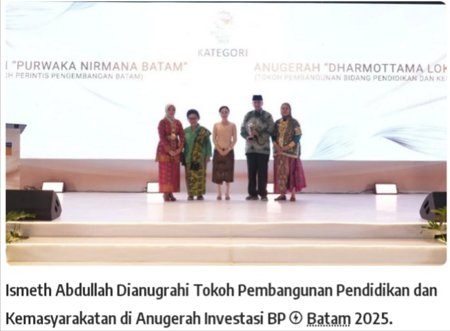 DNews|Batam Mantan Gubernur Kepulauan Riau, Ismeth Abdullah, menerima Anugerah “Dharmottama Loka” sebagai Tokoh Pembangunan Bidang Pendidikan dan Kemasyarakatan pada ajang Anugerah Investasi BP Batam 2025. Penghargaan tersebut diserahkan langsung dalam acara puncak Purwaka Nirmana Batam yang digelar oleh Badan Pengusahaan (BP) Batam. Sabtu, 25 Oktober 2025.