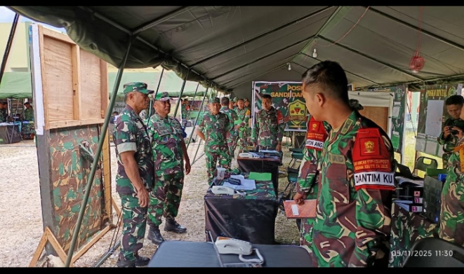 Dinastinews.com Natuna —Komandan Pusat Simulasi Tempur (Pussimpur) Kodiklatad, Kolonel Inf Trijoko Adiwiyono, S.H., M.Si, meninjau langsung penggunaan Aplikasi Simpur Holomatrix pada Latihan Posko I (Latposko I) dalam rangka mendukung digitalisasi latihan di Batalyon Komposit 1/Gardapati, Kodam XIX/Tuanku Tambusai, Natuna, Kepulauan Riau, Rabu (05/11/2025).