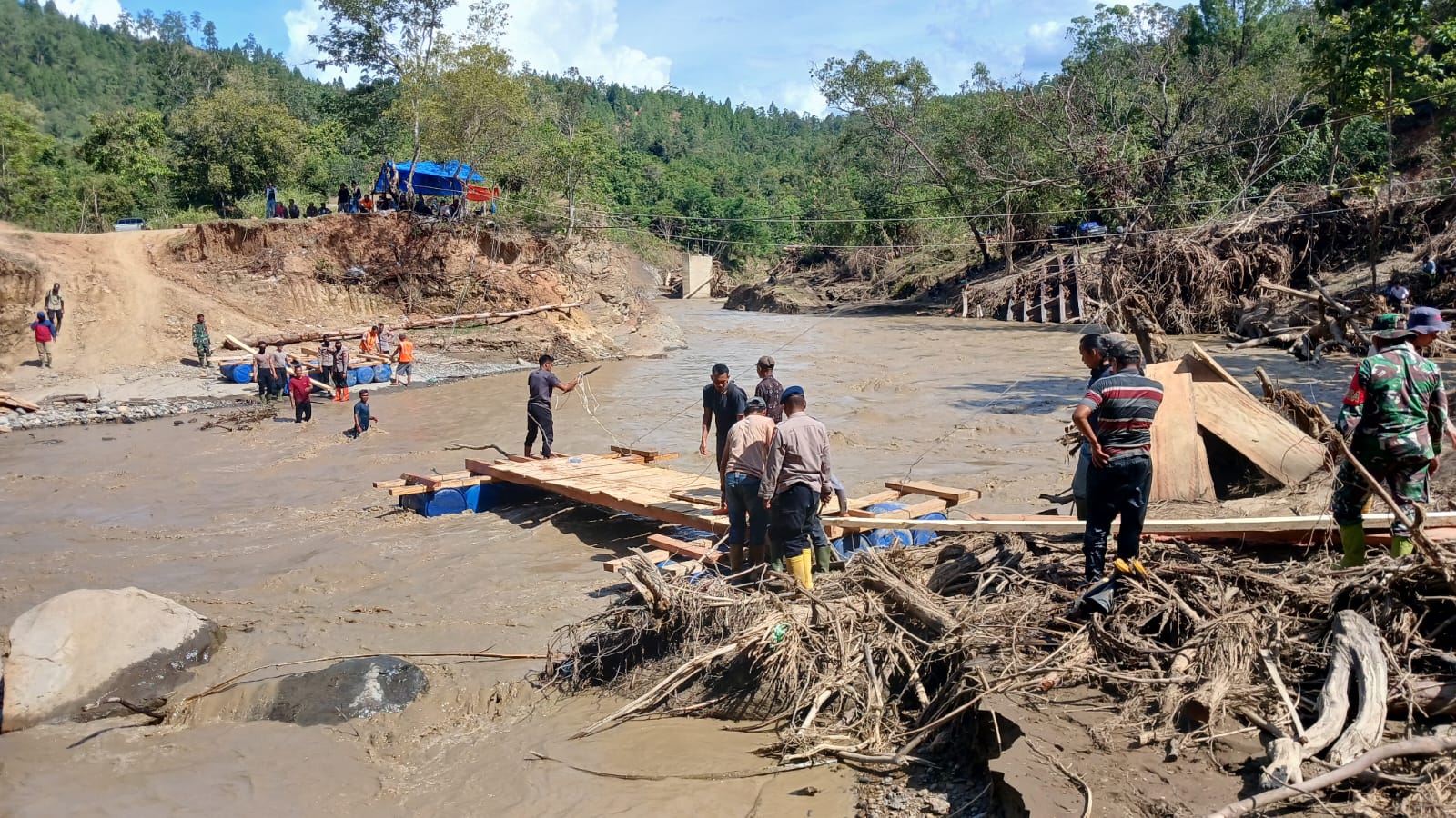 Jembatan darurat tersebut dibangun dengan memanfaatkan drum dan material kayu agar dapat segera digunakan masyarakat dalam menunjang aktivitas sehari-hari, baik menuju desa sekitar maupun ke luar wilayah kecamatan.