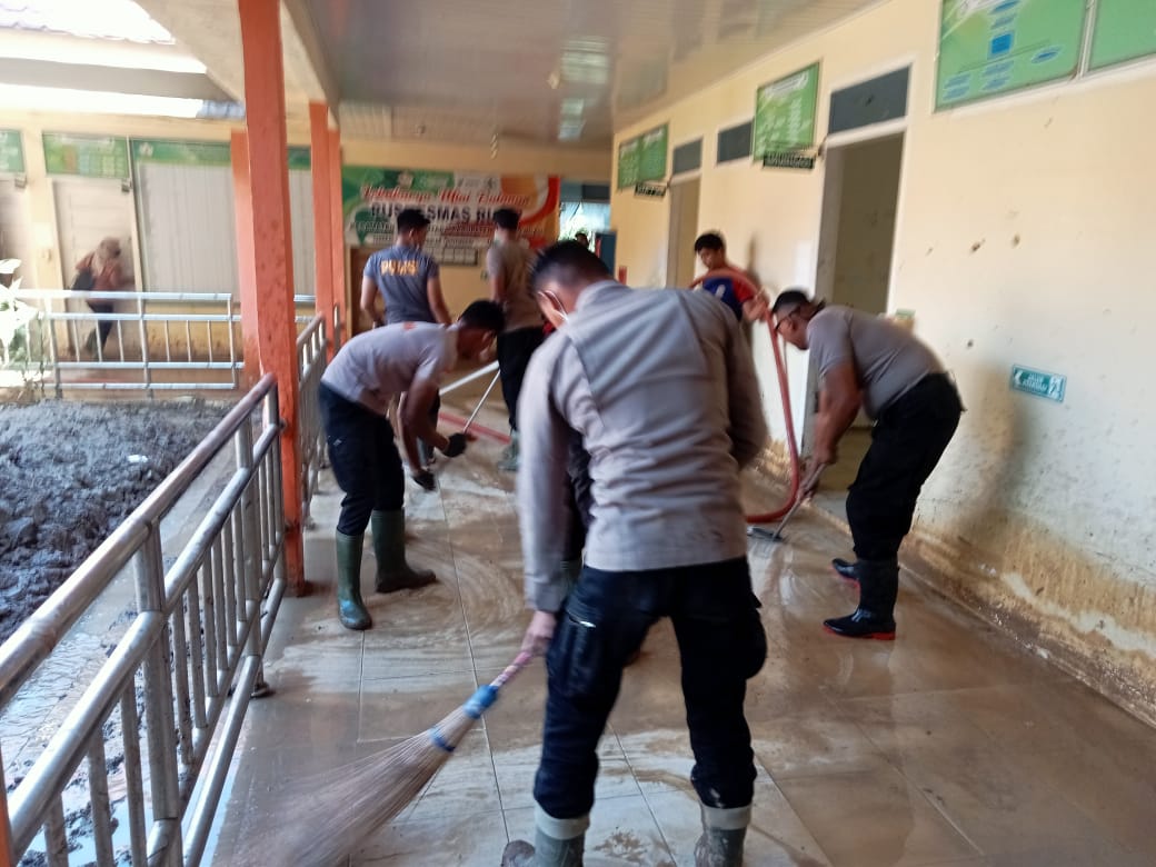 Di lokasi kegiatan, personel gabungan bahu-membahu membersihkan sisa lumpur yang masih menempel di lantai dan dinding bangunan puskesmas, sehingga fasilitas kesehatan tersebut dapat kembali difungsikan secara maksimal.