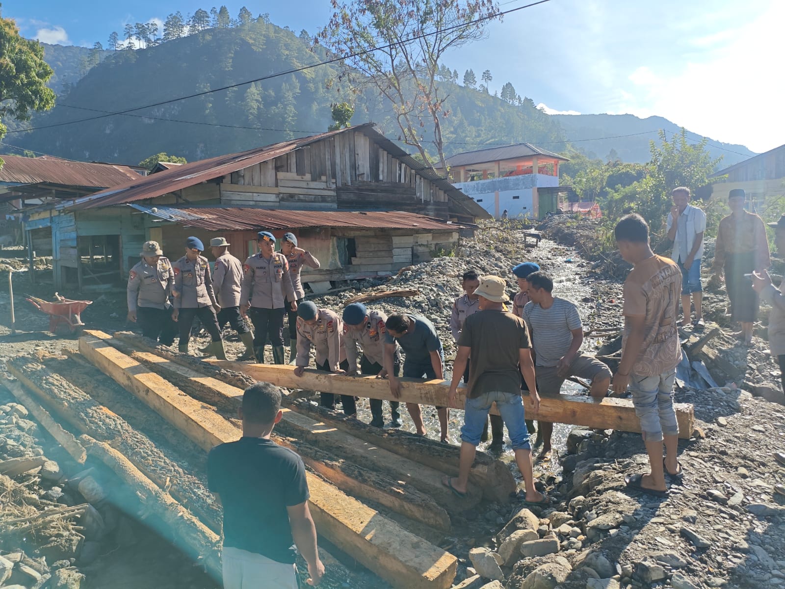 Polri hadir bersama masyarakat untuk memberikan solusi nyata atas kesulitan yang dihadapi warga. Pembangunan jembatan darurat ini merupakan wujud sinergi dan kepedulian agar akses masyarakat dapat segera pulih dan aktivitas sehari-hari kembali berjalan,” ujar AKP Feri.