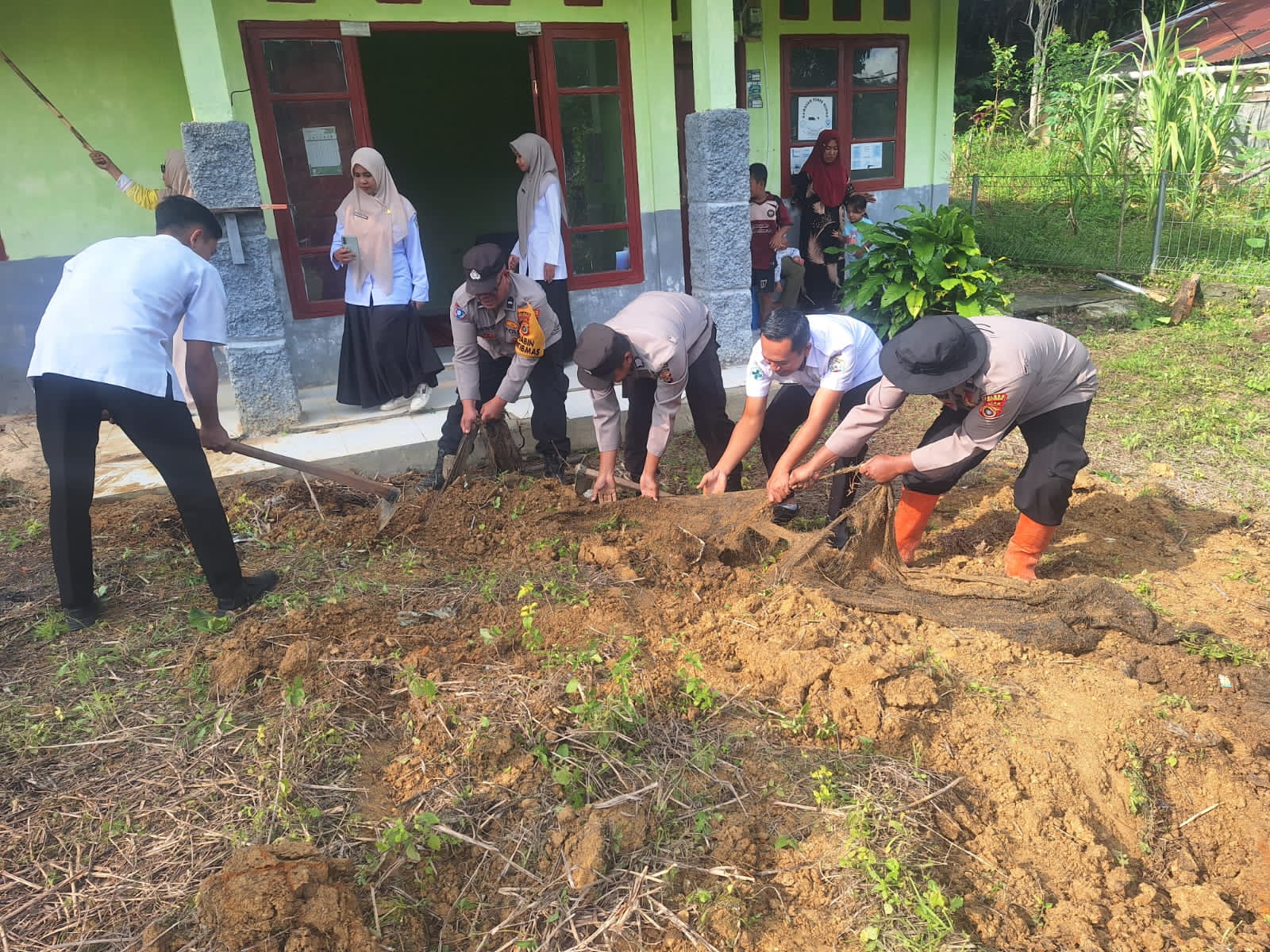 Dengan penuh semangat kebersamaan, personel Polsek Celala bersama warga bahu-membahu membersihkan sisa material yang menutupi ruangan maupun halaman Polindes.