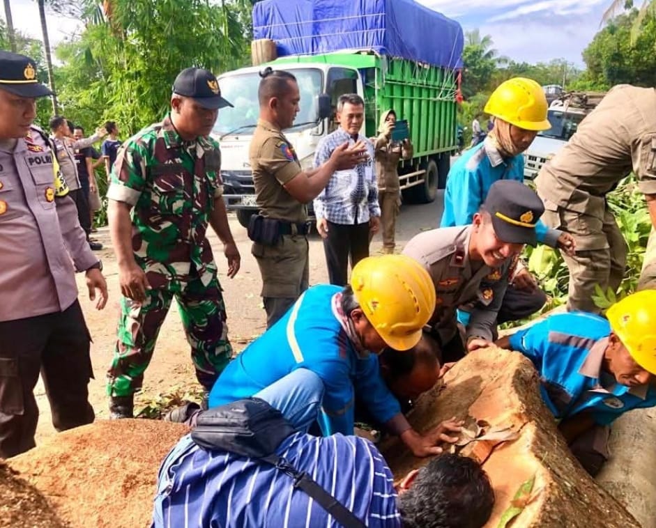 Akses Jalan Terhalang Pohon Besar Tumbang, Babinsa dan Polri Sigap Buka Akses Lintas Jambi–Sarolangun