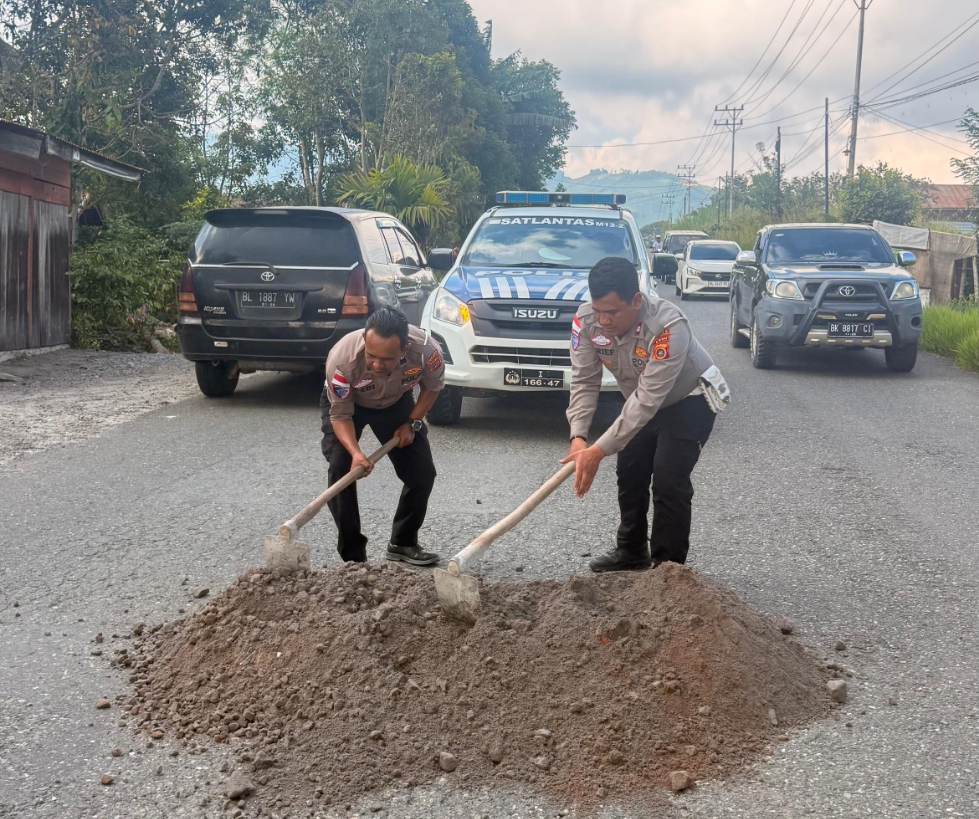 DinastiNews.com | Bener Meriah , Satuan Lalu Lintas Polres Bener Meriah turun langsung menambal jalan berlubang di sejumlah titik rawan kecelakaan. Kegiatan ini dilakukan di jalur dua depan Mapolres Bener Meriah menuju Pante Raya sebagai langkah cepat menekan angka kecelakaan lalu lintas. Jumat 24 April 2026.