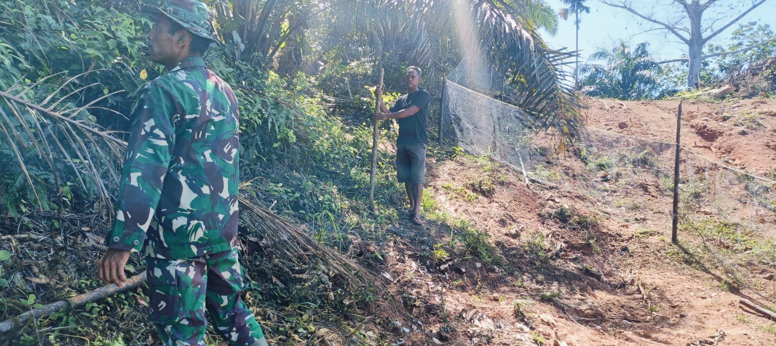 Kegiatan tersebut dilakukan oleh Serda Sandy Boni yang turun tangan bersama warga setempat, salah satunya Kiki. Dengan penuh semangat gotong royong, mereka bahu-membahu menyelesaikan pemasangan pagar dan jaring yang akan digunakan untuk melindungi area pertanian warga.