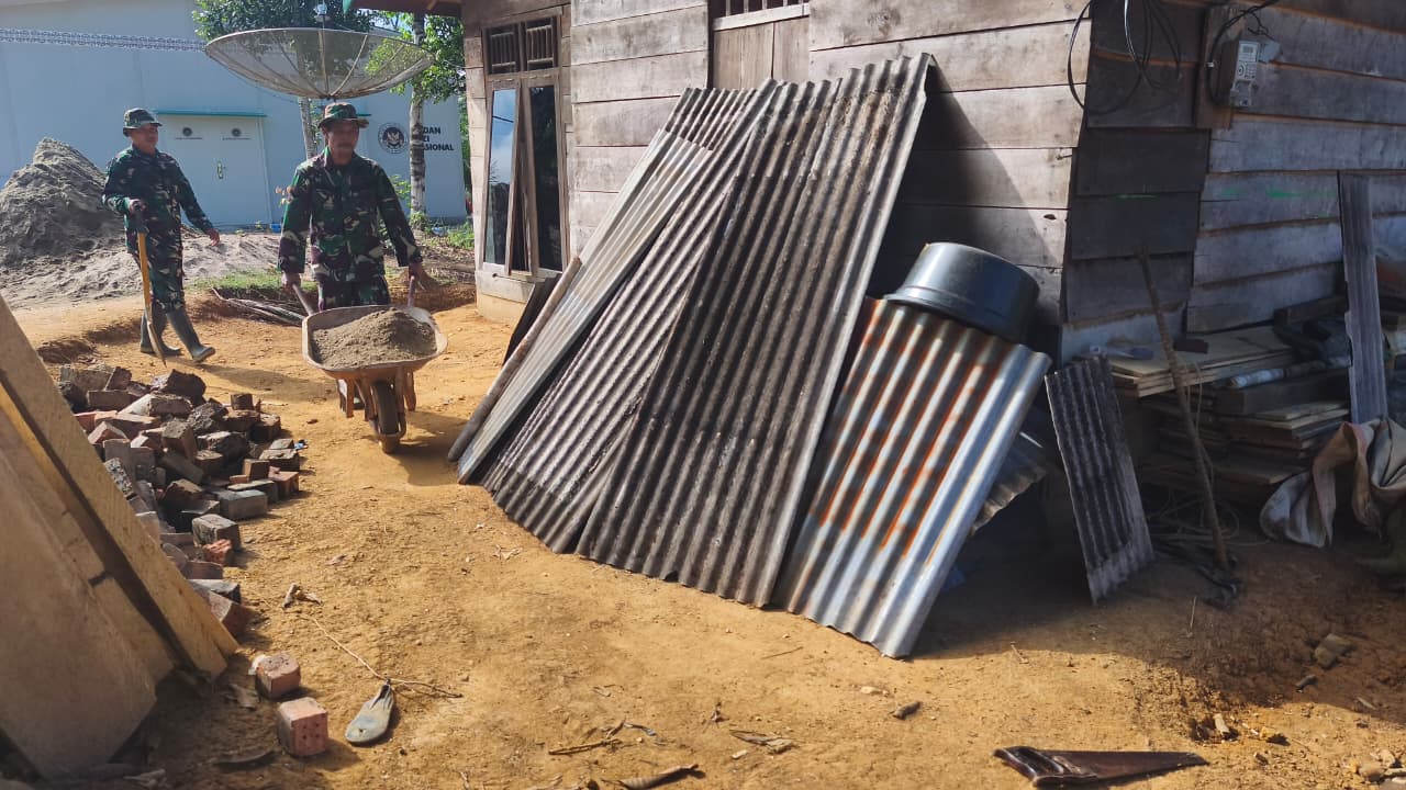 Sarolangun-Semangat gotong royong dan pengabdian kepada masyarakat ditunjukkan oleh anggota Satuan Tugas (Satgas) TMMD ke-128 Kodim 0420/Sarko dalam pembangunan Rumah Layak Huni milik Bapak Kuadi.